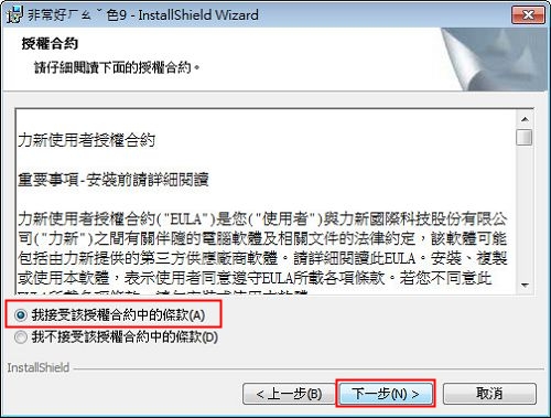 2 拖曳捲軸,閱讀一下授權合約後,點選【我接受】,按【下ㄧ步】。 |